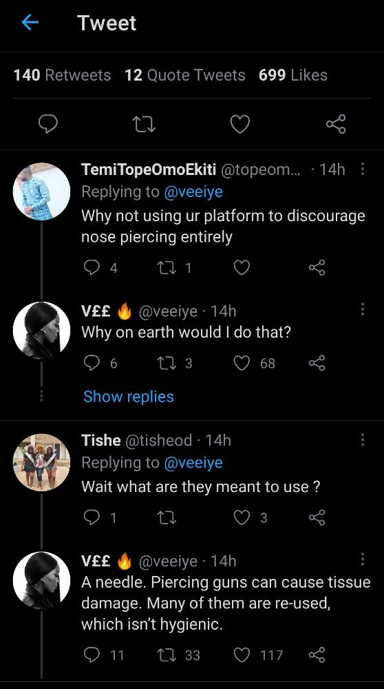 Vee’s comment comes after a photo of a lady lamenting on social media about how her nose was messed up when she went to a shop to get a nose piercing done