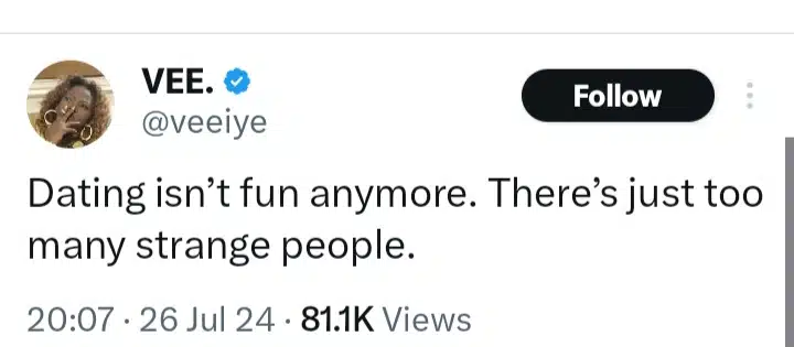 Her tweet sparked a conversation among her followers. Many agreed with Vee’s opinion, sharing their own experiences and concerns about dating.