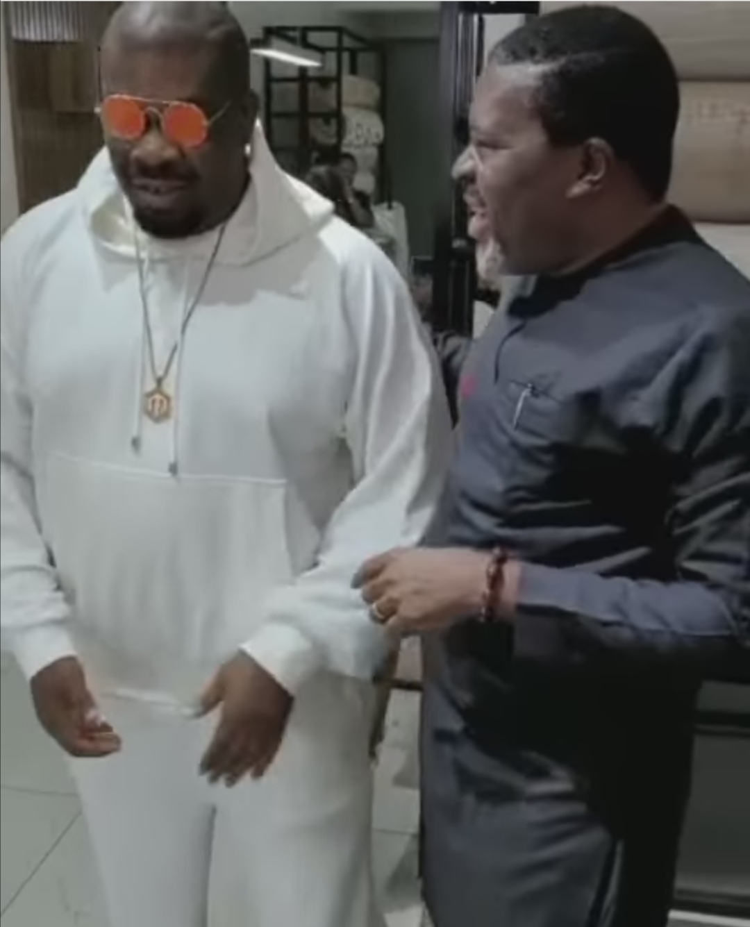 The music producer was surprised with a meet up with the actor at a home decor and as soon as he (Don Jazzy) saw him, he quickly shouted, “hey Jesus”, before humbly going down on his knees to hold Kanayo’s leg in greetings and to hail him.