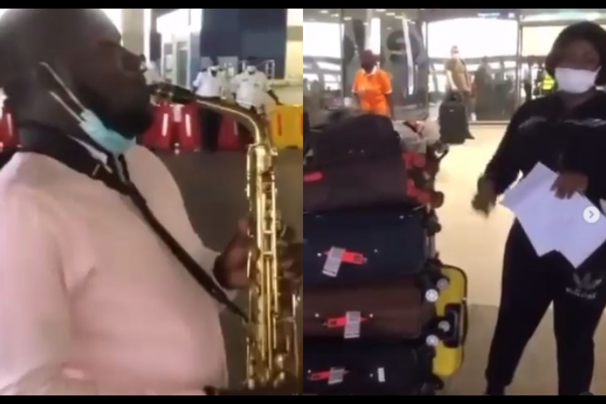 In videos posted to Instagram, the Saxophonist was seen playing the song as Tracey Boakye landed at the KIA from Turkey.