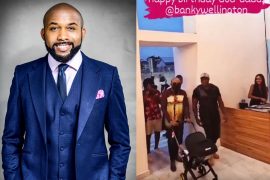 Nigerian singer, Banky W, caused stirs on social media after he walked into a surprised birthday party with his newly born son, Zaiah.