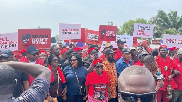 The protest is aimed at preventing the sale of SNNIT hotels to Rock City Hotel, a company owned by the Minister of Food and Agriculture, Bryan Acheampong.