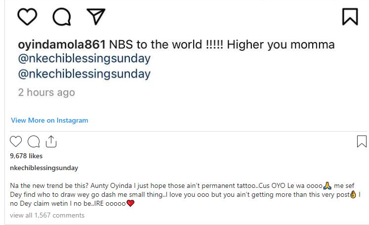 “Na the new trend be this? Aunty Oyinda I just hope those ain’t permanent tattoos..Cus OYO Le wa oooo me sef Dey find who to draw wey go dash me small thing..I love you ooo but you ain’t getting more than this very post