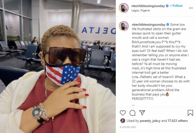 Some low life frustrated idiots on the gram are always quick to open their gutter mouth and call a woman Bitch, prostitute, you F**k this,f**k that!!! And I am supposed to cry my eyes out? Or feel bad? When I do not remember telling you or anyone else I was a virgin that hasn’t had sex before? Ya, all must be moving mad…it’s high time all this frustrated internet troll get a better Line… a Pathetic set of losers!!! What a 32-year-old woman chooses to do with her body shouldn’t be your generational problem…Mind the business that pays you PERIODTTTT!!!