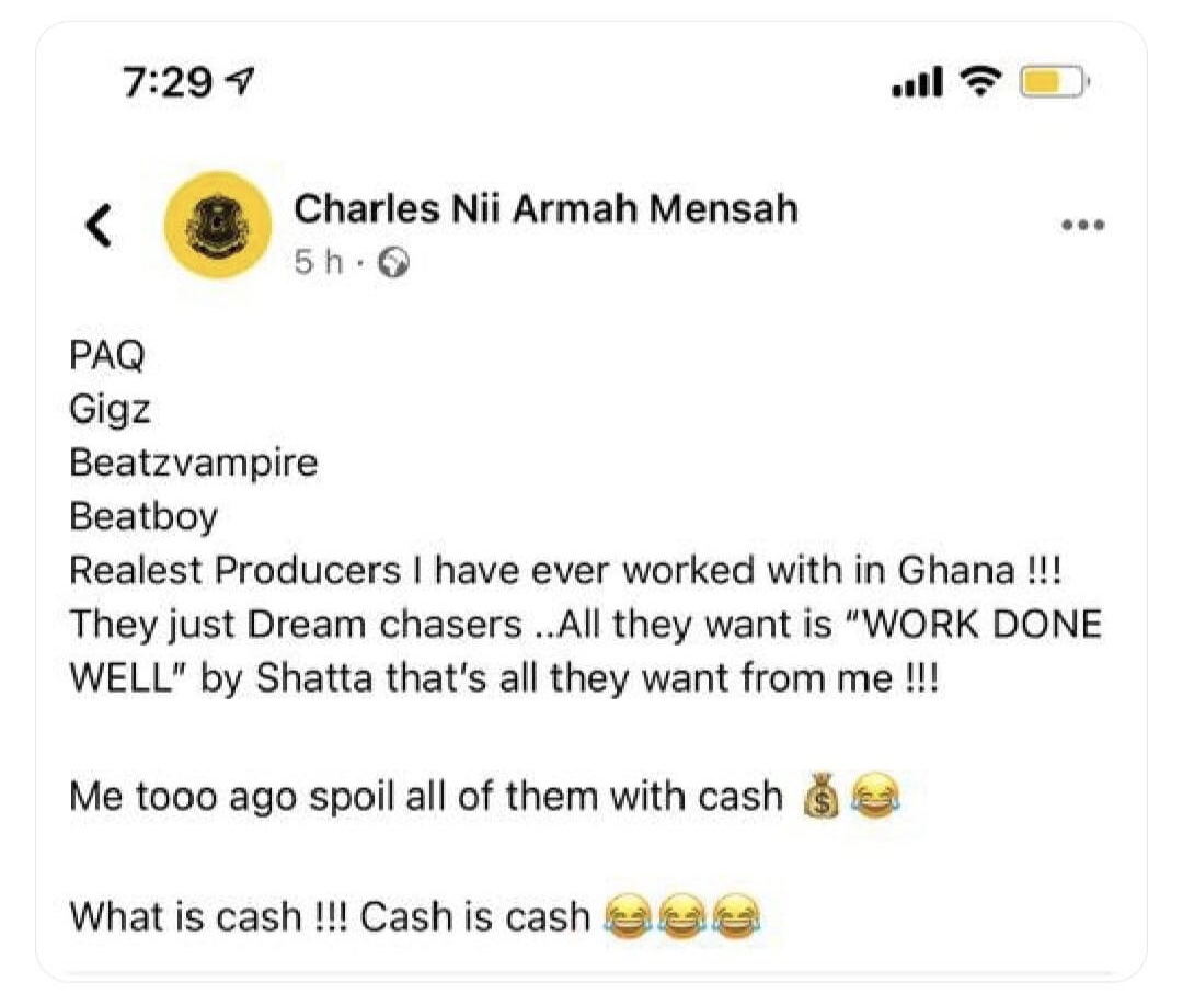 Shatta Wale reveals that these producers were not demanding money from him but only wanted him to do a good song on the beat. He described them as dream chasers and that all these producers wanted is work done well.