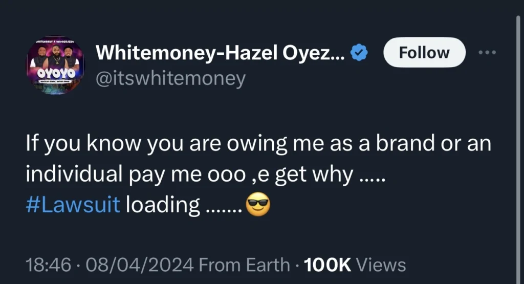 Whitemoney, who has experienced challenges with debtors failing to pay him, used his Twitter platform to address the issue directly. He urged his debtors to settle their debts promptly to avoid legal repercussions, emphasizing that he will not hesitate to pursue legal action if necessary.