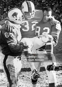 (Original Caption) After returning a kickoff , which was the last play of the first half, O.J.Simpson was carried off the field by Joe O’Donnell (67) and Al Cowlings (62). Simpson was taken to the hospital for x-rays and may be out for the remainder of the season.
