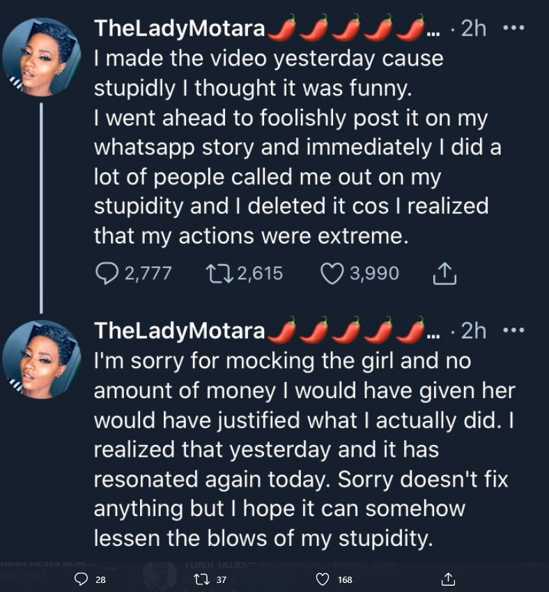 Motara is a Nigeria social media influencer who in 2020 incurred the wrath of social media users after her video went viral for teasing a beggar in traffic.