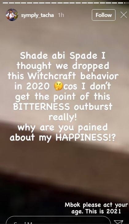 “Shade abi Spade I thought we dropped this Witchcraft behavior in 2020 ?’cos I don’t get the point of this BITTERNESS outburst really! why are you pained about my HAPPINESS!?