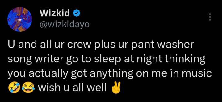 In his words: “U and all ur crew plus ur pant washer song writer go to sleep at night thinking you actually got anything on me in music 🤣😂 wish u all well ✌️. U know what..no point. delusional niggas 😇 pray for y’all. Pant washer song writer help your boss write reply Abeg . I don tire I Dey go sleep 😂 Jesus is King”