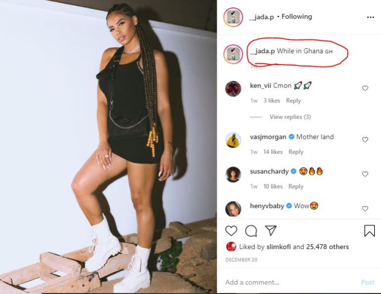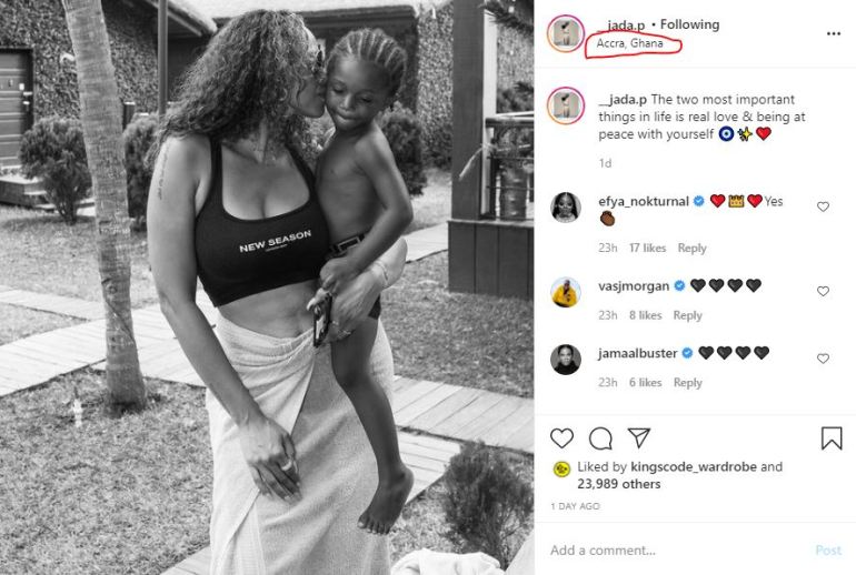 Well, Photos shared by Jada Pollock on social media reveals that she has joined Wizkid in Ghana a week after they returned to Nigeria from London. She shared the photos on her official Instagram handle, and the location was Ghana as one of the posts she wrote, While in Ghana.