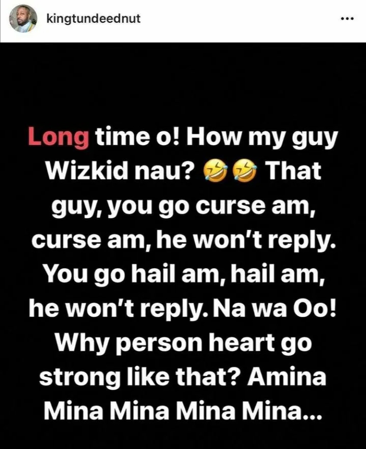 In a post he made, he asked if Wizkid is there because its been a long time since he heard from him. He explained that, wizkis is someone who does not reply to trolls or applause. Tunde said has a strong heart and only responds to shades when he wishes.