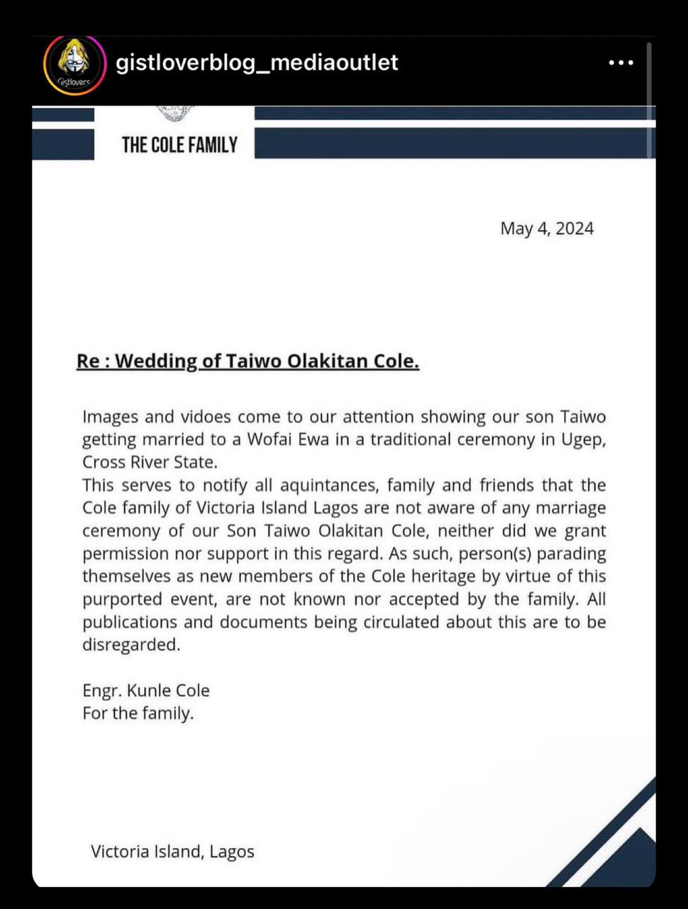 The statement read: “Images and videos come to our attention showing our son Taiwo getting married to a Wofai Ewa in a traditional ceremony in Ugep, Cross River State. This serves to notify all acquaintances, family, and friends that the Cole family of Victoria Island Lagos are not aware of any marriage ceremony of our Son Taiwo Olakitan Cole, neither did we grant permission nor support in this regard.”