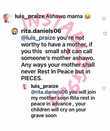 Rita Daniels who was unhappy about this comment, responded and said, “You’re not worthy to have a mother if you this small sh!t can call someone’s mother ashawo. Anyways your mother will never Rest in Peace but in PIECES”.