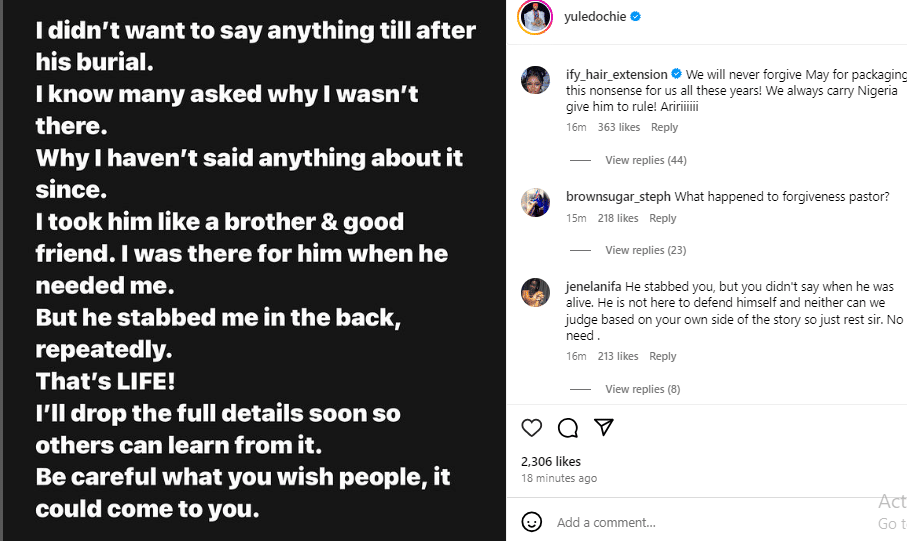 “I didn’t want to say anything till after his burial. I know many asked why I wasn’t there. Why I haven’t said anything about it since. I took him like a brother & good friend. I was there for him when he needed me. But he stabbed me in the back, repeatedly. That’s LIFE! I’ll drop the full details soon so others can learn from it. Be careful what you wish people, it could come to you.”